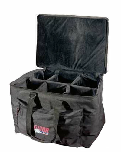 The Gator Cases GP-40 Par Can Light Bag features durable 600-Denier nylon construction, 20mm foam protection, synthetic fur lining, comfortable web handles, a shoulder strap, movable velcro interior dividers, and an exterior storage pocket.