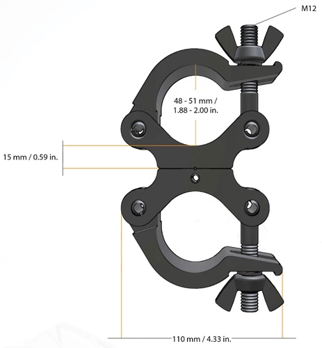 The Global Truss Pro Swivel Clamp/BLK is a heavy duty dual swivel clamp designed for 50mm Tubing with a black powder coat finish.