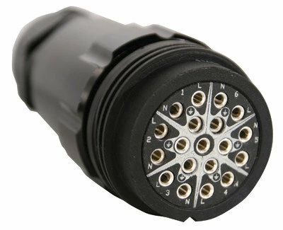 This connector is used to connect power to six circuits of theatrical or motion picture luminaries. It is also used for assembly or repair of six circuit lighting extension cables and equipment cables. 19 pin, 6-circuit, 23 Amp, 600 VAC, LSC19 female inline connector, crimp termination, black finish.