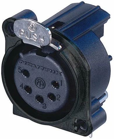 5-pole female XLR receptacle, grounding: separate ground contact to mating connector shell and front panel, horizontal PCB mount, black chrome shell