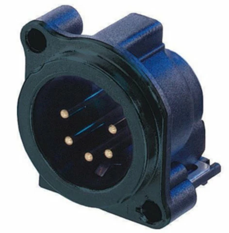 The Neutrik NC5BMV-V is a 5-pole male XLR receptacle, grounding: separate ground contact to mating connector shell and front panel, vertical PCB mount, black chrome shell.