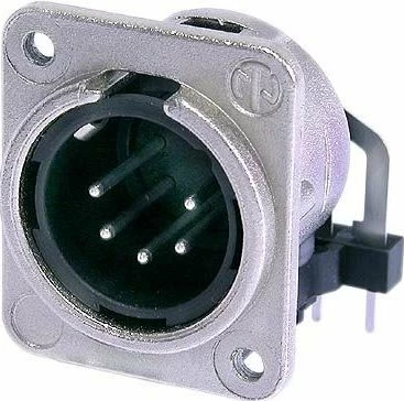 Universal D-size metal body XLR panel mount series. UL recognized component. 5-pole male receptacle, horizontal PCB mount, Nickel housing, silver contacts, M3 mounting holes
