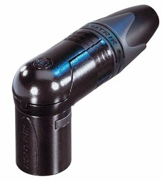 5 pole right angle male cable connector, black metal housing, gold contacts.