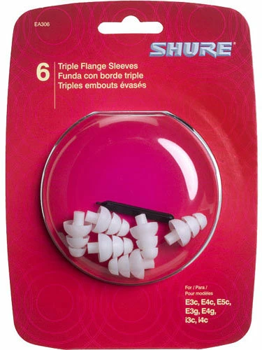 3-pair package of triple flange sleeves for Shure E3c, E4c, E5c, E500, i3c, and i4c earphones. The comfortable silicone sleeves are washable and reusable. The triple flange sleeves form a tighter seal than Shure’s flex sleeves, helping to block out more ambient noise. The tube (flange) of the sleeve can be trimmed for a better fit.