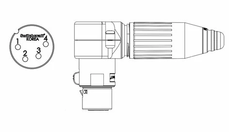 4-pin Right angle, male cord mount plug, latching. New style incorporates an insert that can rotate every 45° for added flexibility in tight applications. Also utilizes the new strain relief system with twist-on handle.