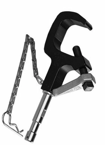 The Mega-Baby is designed to allow location style lighting fixtures, (lighting fixtures that normally mount to a 5/8″ pin on a floor stand), to be hung from the studio grid. The fixture is mounted onto the Mega-Baby’s chrome plated 5/8? × 2-1/2″ steel stud. A Spring Steel 1/8″ Hairpin safety clip is attached to the clamp with chain. The Mega-Square handle is included for fastening the Mega-Baby to the grid without tools.