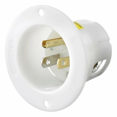 This is the HBL5278C, a 2-pole 3-wire 15A/125VAC NEMA 5-15P straight blade Grounding Flanged Inlet, made of white nylon casing, brass blades, #8-32 brass multi drive screw terminals, cold rolled steel-nickel plated terminal clamp, steel-nickel plated Assembly screws and nickel plated brass mounting screws. It has back wired terminations for ease of installation.