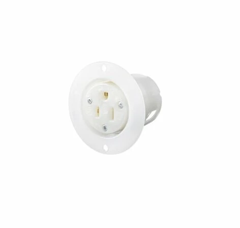 This is the HBL5279C, a 2-pole 3-wire 15A/125VAC NEMA 5-15R straight blade Grounding Flanged Receptacle, made of white nylon casing, back wired, brass contacts, #8-32 brass multi drive terminal screws, cold rolled steel-nickel plated terminal clamp, steel nickel plated assembly screws and nickel plated brass mounting screws.